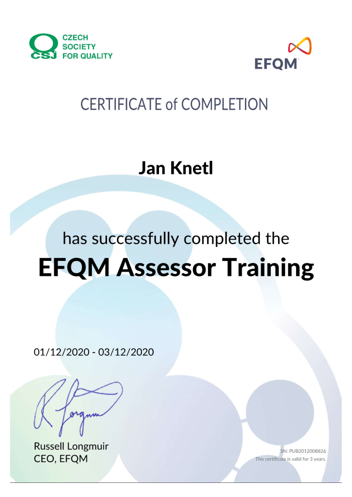 Lektor a průvodce procesem jsem já, Jan Knetl, mimo jiné hodnotitel modelu EFQM a čeln expertní skupiny MPSV pro tvorbu Programu dobrovolného rámce kvality.